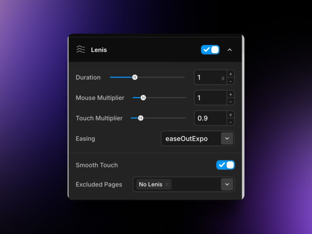 To enable Lenis, simply toggle it on from right here in the Global Settings! Clicking on the panel will expand the properties, explained below: